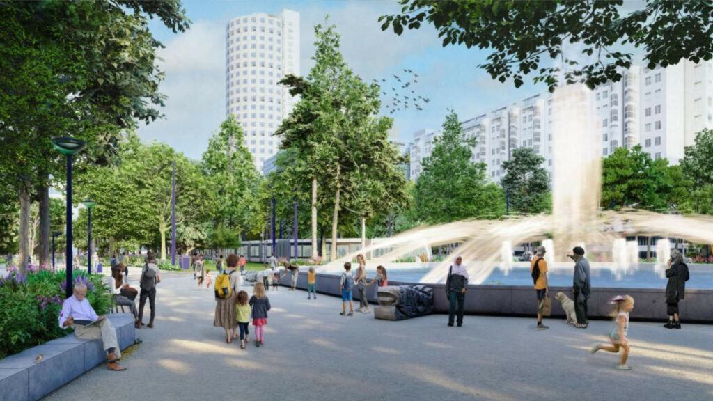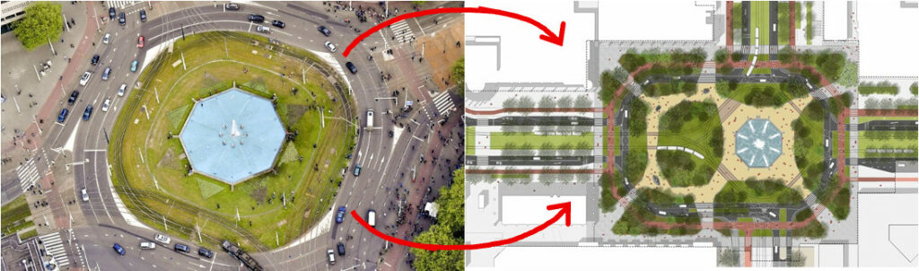 Stel je voor: een groot groen middengebied met gras, bomen en zitplekken. De iconische fontein als echt hart, omringd door beloopbare zones. Brede voetgangersoversteekplaatsen verbinden alle hoeken, met brede tweerichtingsfietspaden langs de plinten voor fietsers, terrassen en voetgangers. Op papier ontstaat een plek om te ontmoeten, te hangen of de stad te bekijken – een wereld van verschil met het huidige verkeersplein.